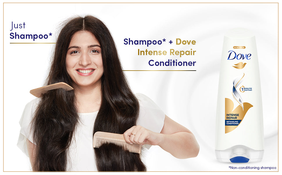 Does your hair get frizzy and unmanageable? Are you left wishing for a remedy to fix your frizzy tassels? Do you want to know the secret to fixing frizzy hair? Try New Dove Intense Repair Conditioner. Control frizz with a nourishing conditioner that’s formulated to nourish and help with frizz prevention. Formulated with Keratin Actives, Dove Intense Repair Conditioner helps to nourish dry and frizzy hair with two-way care. It controls external signs of dryness in the form of frizz, while nourishing strands to help them look their best. This conditioner for frizzy, damaged hair leaves hair visibly smooth and more manageable – giving you smoother hair* that you will be proud of. Use it after your shampoo on damp hair for best results. This nourishing conditioner works immediately to smoothen the hair surface, deeply nourishing to moisturize hair strands for healthier looking and smoother*hair. With every use, you’ll be left with smooth, shiny and beautiful hair. Buy New Dove Intense Repair conditioner and treat your hair to a look that will be the cause of envy among all your friends. Dove Conditioners, for 100% care.*Based on lab test with Dove Intense Repair system vs non-conditioning shampoo