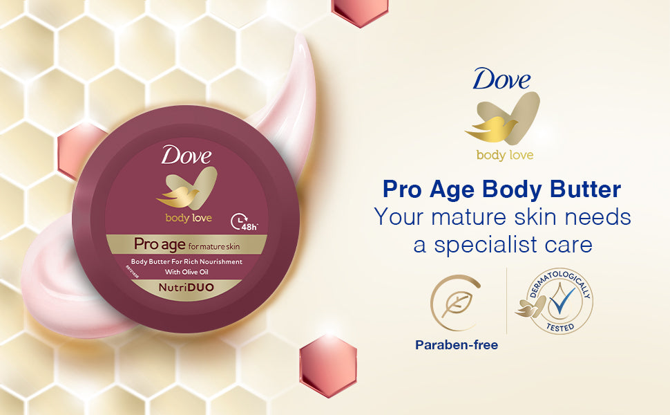 Presenting Dove Body Love Pro Age Body Butter. A unique solution to manage your mature skin. With Pro Age unique formulation enjoy a nourished & radiant skin