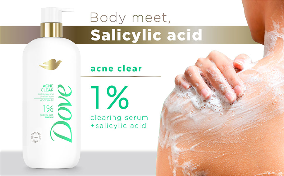 "Another body breakout? Meet Dove Acne Clear Bodywash. Co-created with dermatologists, and made with a 1% salicylic acid clearing serum, our refreshing gel body wash transforms into bubbly lather with fresh and herbal scents to treat body acne. Foam up to a deeply cleansed skin, purify your pores and prevent acne breakouts. This Acne clearing bodywash brings expert care to your shower routine by infusing the active ingredients you already use (and love) in your face care routine. Why choose Dove Acne Clear Bodywash with 1% Clearing Salicylic Acid? 1. Caring for your unique skin needs - We partnered with dermatologists to co-create a body wash with Salicylic Acid, specially formulated to give your skin the specialized care it deserves. 2. Reducing breakouts - When you lather up with our Acne Clear Body Wash, you get a powerful cleanser that penetrates your pores and helps reduce acne breakouts. 3. Mild and gentle on the skin - Our bodywashes are sulfate and paraben free, plant-based cleansers with a PH balanced formula. 4. Serumize your shower - Give your body the expert care it deserves with active ingredients you know and love to put on your face! We believe in beautiful, visibly healthy skin from head-to-toe."