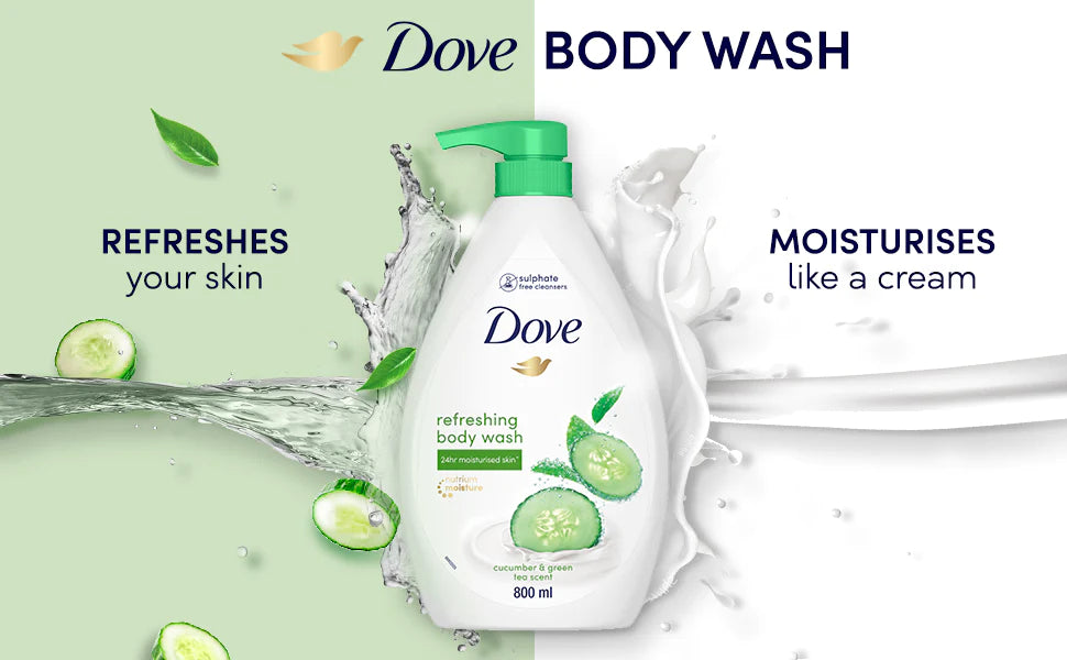 Looking for a body wash that cleans like a soap and moisturises like cream? Dove Refreshing Body Wash does both. It cleans your skin like a soap and keeps it moisturised for 24 hours. Dove Refreshing Body Wash, with Cucumber & Green Tea scent, is enriched with a gentle cleansing formula and Dove’s signature ¼ moisturizing cream to give you softer, smoother skin after every shower. Its Nutrium Moisture technology and mild cleansers penetrates up to 3 layers deep, to help your skin retain its natural moisture, leaving you with moisturised, healthy glowing looking skin. It's mild, pH-balanced formula, makes it a great body wash for dry skin, unlike typical bathing soap or shower gel. Dove Body Wash, with sulphate free/paraben free cleansers, 100% gentle cleaners & 100% plant based moisturises, nourishes deep into the surface layers of the skin, and helps strengthen your skin’s moisture barrier. For best results, squeeze the body wash into your hand or onto a loofah and work it into a rich creamy lather. Massage it over your skin, concentrating on areas that feel a little drier than usual. Rinse off, revealing soft, smooth, moisturised skin. There are 631 million beautiful women of all ages, shapes, sizes and skin tones in India. Yet, we often see things one dimensionally. Together, we can break the rules and represent the true diversity of beauty in India and empower each and every woman in India.